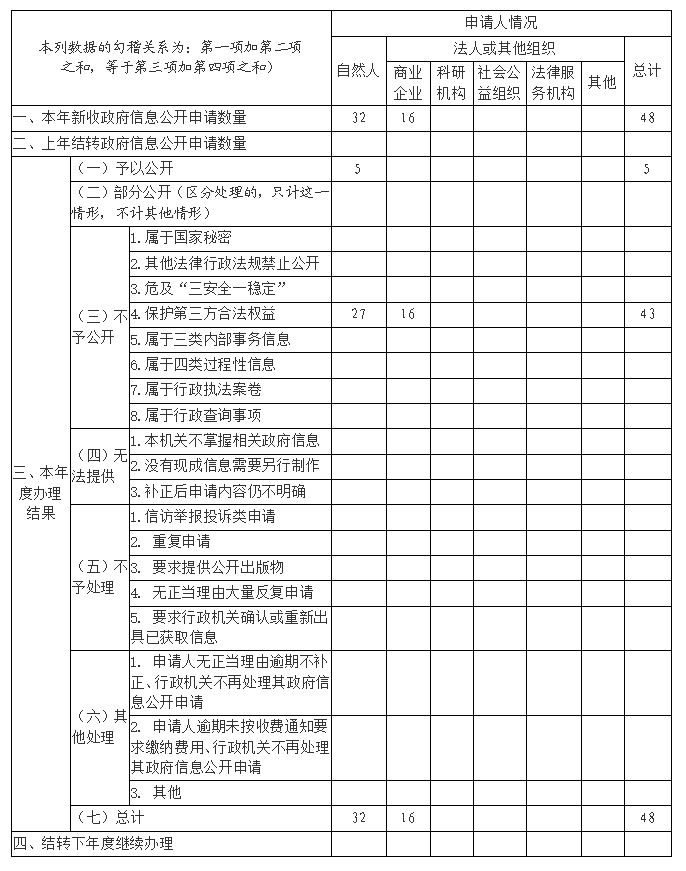 (二)依申请公开情况。2021年,省局收到依申请公开申请48件,其中自然人32件,商业企业16件,所有申请均按要求在法定期限内办理完毕,其中予以公开5件,不予公开43件。